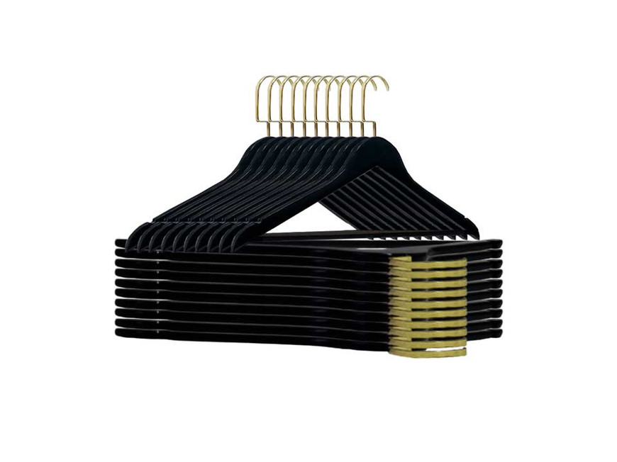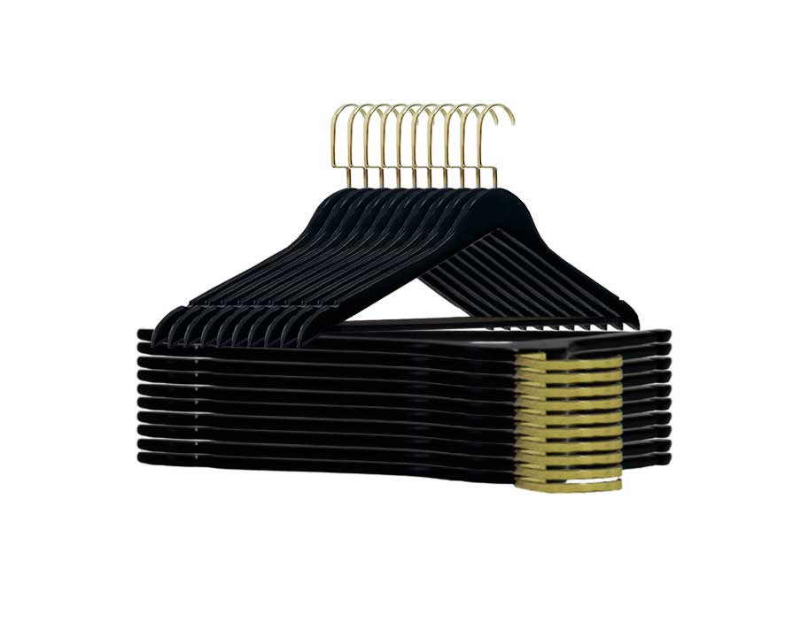 Ideal para calças, camisas, blusas, vestidos e ternos, a barra resistente permite pendurar conjuntos completos com segurança, enquanto o gancho dourado adiciona um toque de brilho elegante que valoriza a apresentação em boutiques, vitrines e closets planejados.