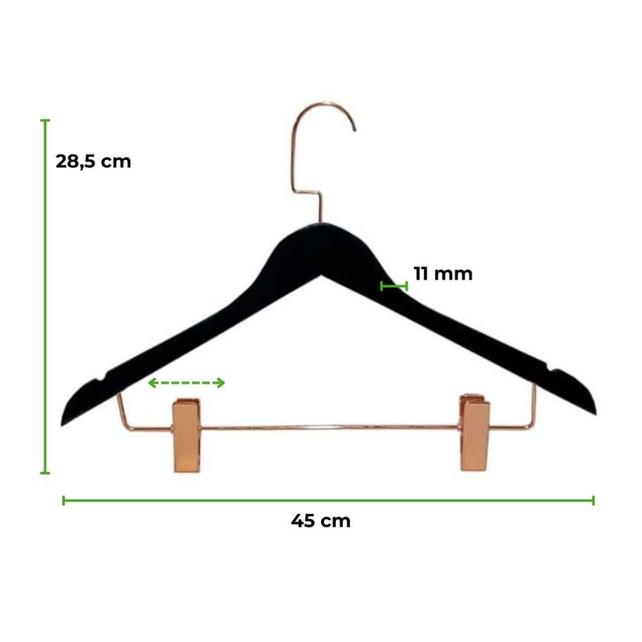 Produzido em madeira de alta qualidade, este cabide combina acabamento sofisticado com um gancho e presilhas reforçadas, garantindo durabilidade e requinte para qualquer ambiente.