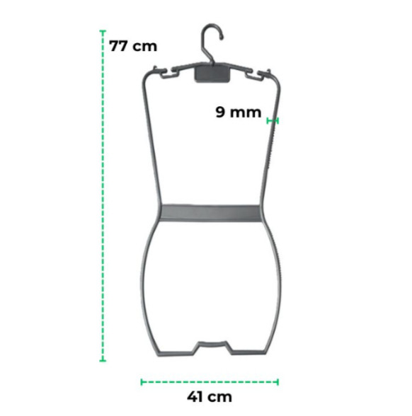 Perfeito para expor biquínis, vestidos, saias, shorts, roupas íntimas e muito mais. Com ganchinhos superiores, você pendura blusas de alça e ainda consegue montar conjuntos completos no próprio cabide.